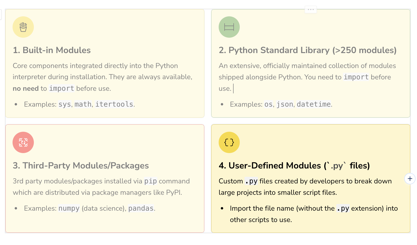Python modules and packages generally fall into four categories: built-in, standard library, third-party, and user-defined (see in Figure 2.4). So far, you’ve worked with the first three — modules that come with Python (e.g., datetime) or are installed from external sources (e.g., pandas).