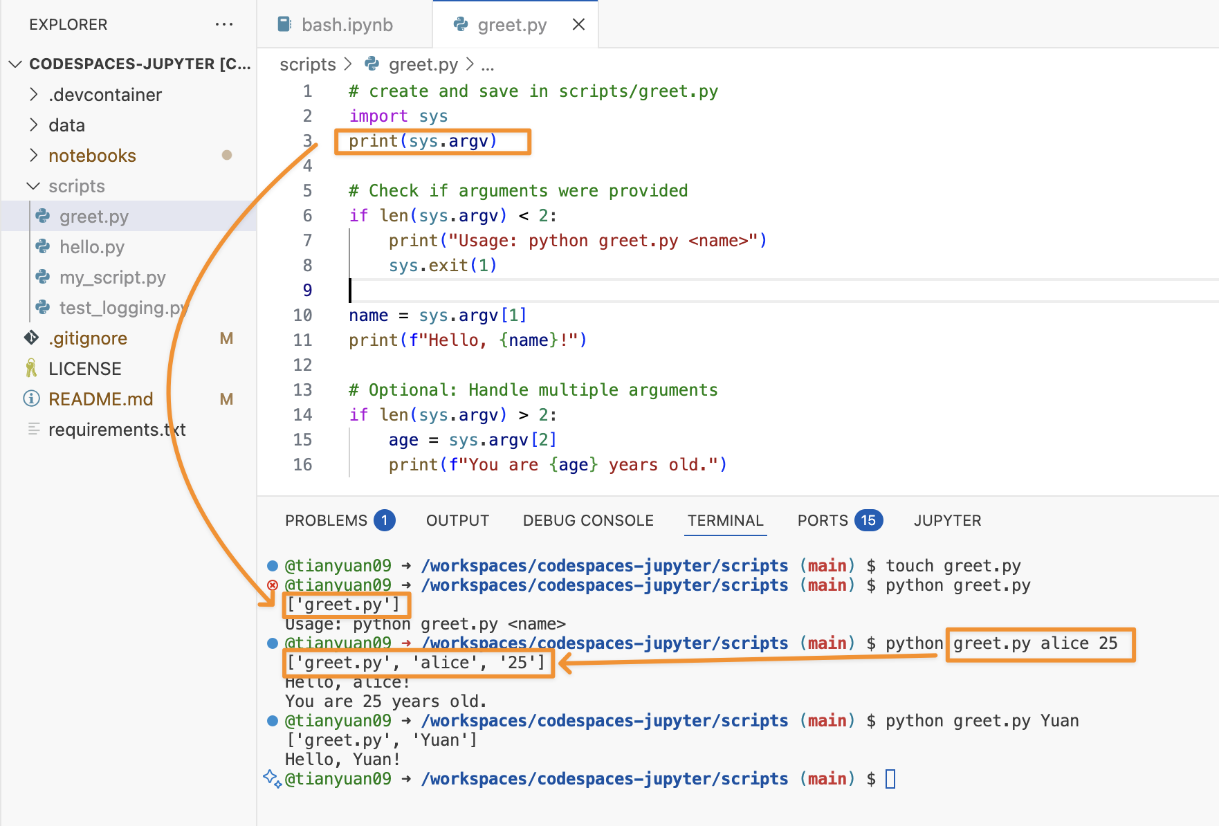 sys.argv[0]is always the script name (greet.py)sys.argv[1]is the first real argument that the user provides. In this case, the person’s name.